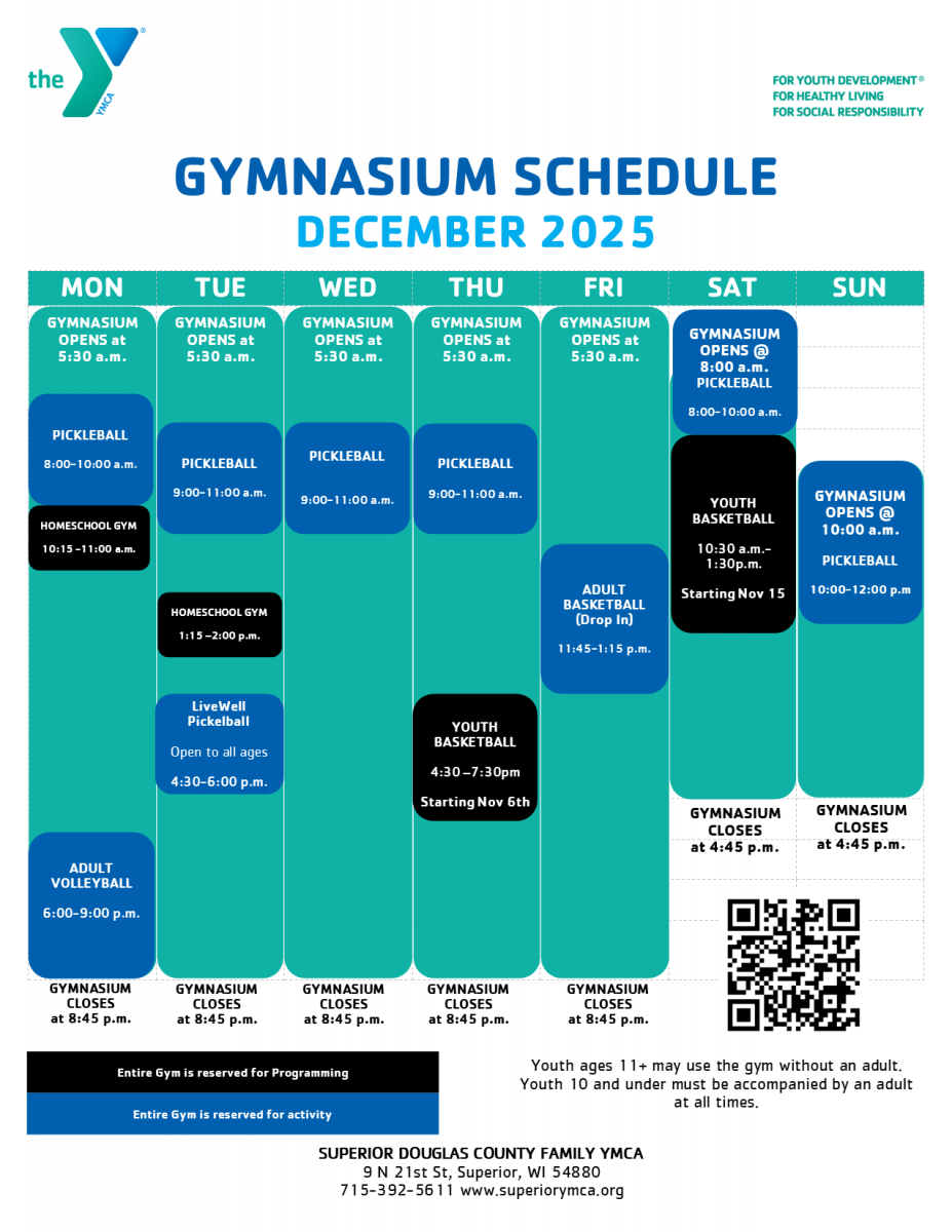 Youth ages 11+ may use the gym without an adult. Youth 10 and younger must be accompanied by an adult at all times.